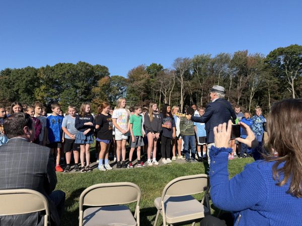 The ceremony then turned musical, as Peter Mundt, Cushing’s longtime music teacher, led a combined fifth-grade chorus from both schools in a performance of “Viva La Vida” by Coldplay. Mundt played his acoustic guitar alongside the students, harmonizing with the chorus, earning enthusiastic applause from the crowd.